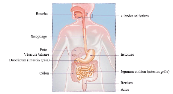Le système digestif, aussi appelé tractus gastro-intestinal, commence par la bouche, puis par le pharynx, le duodénum, l’estomac, l’intestin grêle, le gros intestin et le rectum. Tout au long du système digestif se trouvent également des glandes salivaires, le pancréas et le foie.